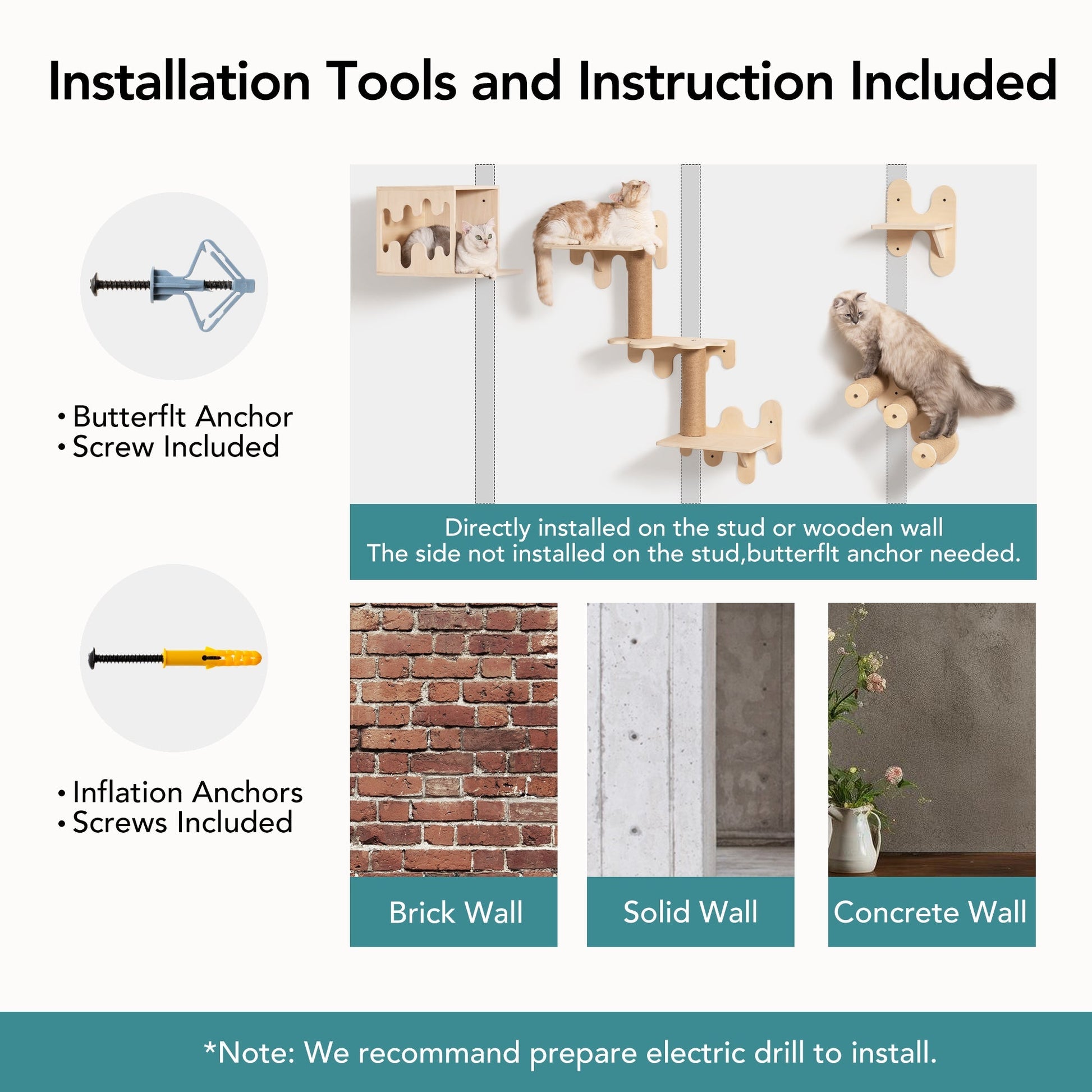 The MewooFun Ice Cream Cat Wall Shelves provide a stylish and functional solution for your cat¡¯s climbing, scratching, and lounging needs. Made from sturdy wood and wear-resistant sisal rope, this wall-mounted set supports cats up to 16 lbs, offering safe and engaging play. Featuring a playroom, jumping platform, sisal-wrapped combi-perch, and ladders, it caters to your feline¡¯s natural instincts while saving floor space. With rounded edges for safety and a sleek design that blends seamlessly with home decor, it¡¯s perfect for active cats and small spaces.